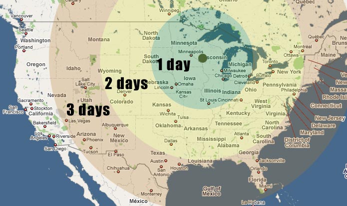 Here is a map showing radial distance from Eau Claire, WI in days, assuming 500 miles per day.